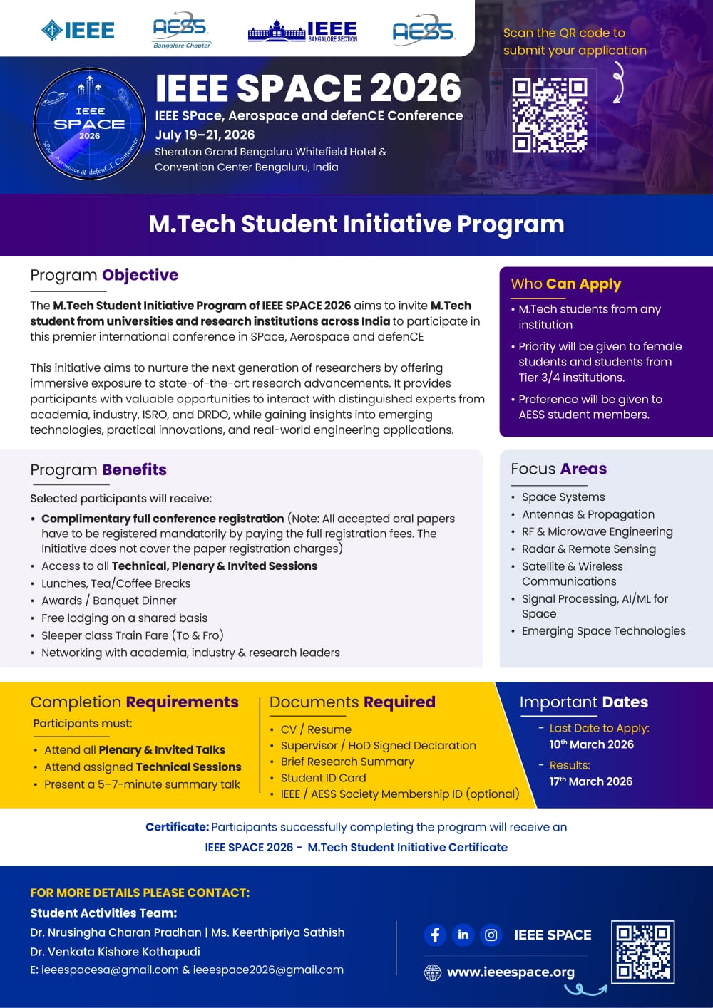 The M.Tech Student Initiative Program of IEEE SPACE 2026 invites M.Tech students from universities and research institutions across India to participate in this premier international conference in Space, Aerospace and Defence.