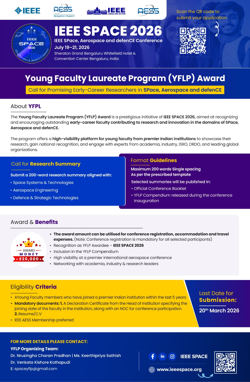 The Young Faculty Laureate Program (YFLP) Award is a prestigious initiative of IEEE SPACE 2026 aimed at recognizing and encouraging outstanding early-career faculty contributing to research and innovation in the domains of Space, Aerospace, and Defence.
